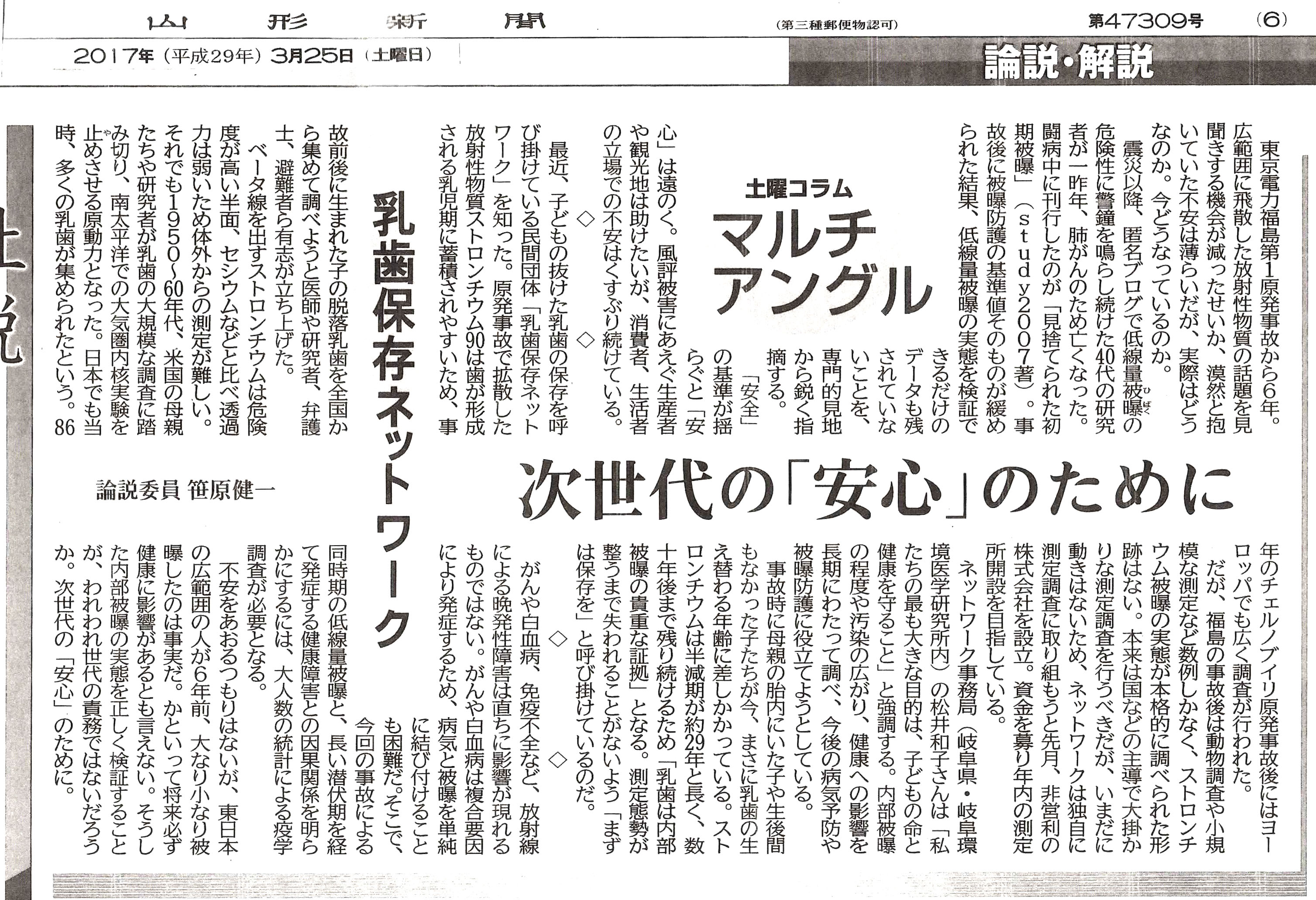 2017.04.23 ・山形新聞「土曜コラム」で乳歯保存ネットワークが紹介されました