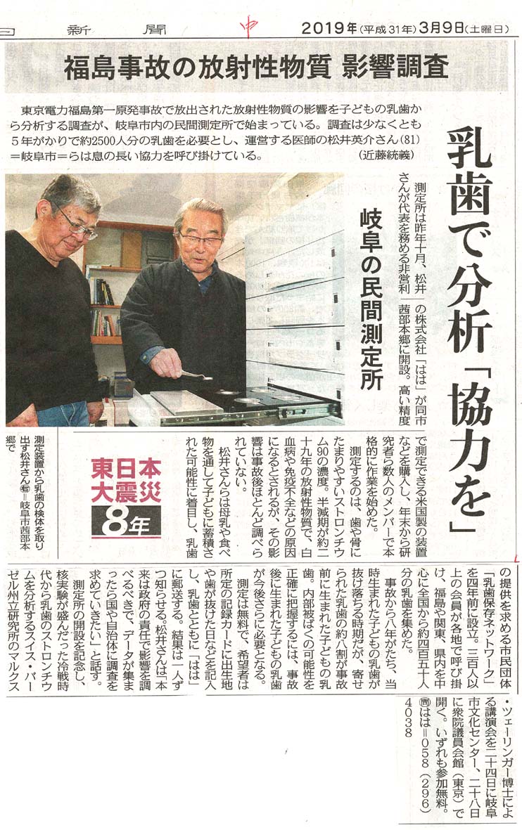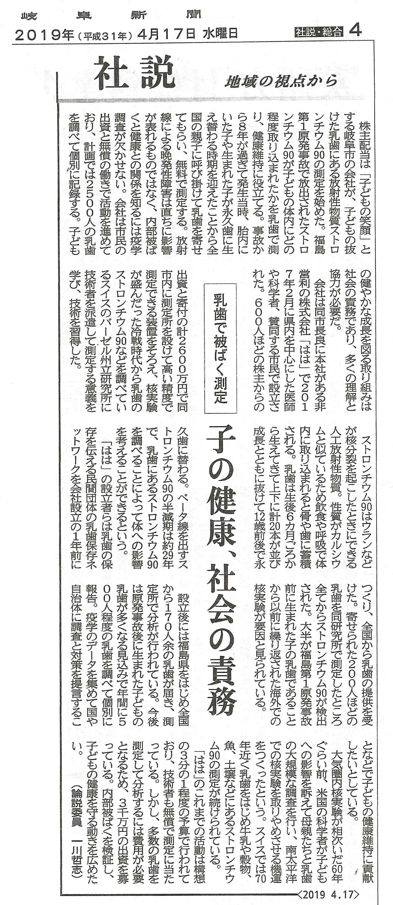 2019.05.07 ・新聞報道掲載記事 乳歯で被ばく測定,子の健康,社会の責務:岐阜新聞社説(2019年4月17日)